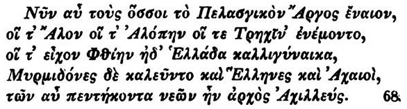 «Και τώρα αυτοί που κατοικούσαν στο Πελασγικό Άργος και αυτοί που ζούσαν στην Άλο και στην Αλόπη και στην Τραχίνα και όσοι από τη Φθία και την καλλιγύναικα Ελλάδα λεγόταν Μυρμιδόνες και Έλληνες και Αχαιοί, αυτοί είχαν πενήντα πλοία με αρχηγό τους τον Αχιλλέα».